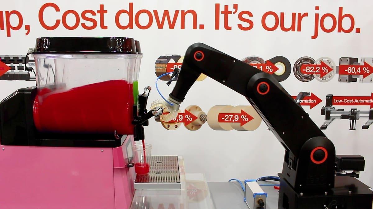 Con il suo spazio di lavoro flessibile, il robot antropomorfo robolink è adatto per le complesse sequenze di movimento. Grazie al suo prezzo contenuto e alla semplice programmazione, è perfetto per l'automazione di applicazioni di ristorazione come in questo caso. In combinazione con la pinza a quattro dita di SoftGripper, gestire la tazza di plastica e la macchina per il gelato è un gioco da ragazzi. La pinza si caratterizza per la sua versatilità. Oltre alle quattro dita di presa, ha anche una ventosa. Ciò consente di afferrare saldamente la tazza senza premerla.