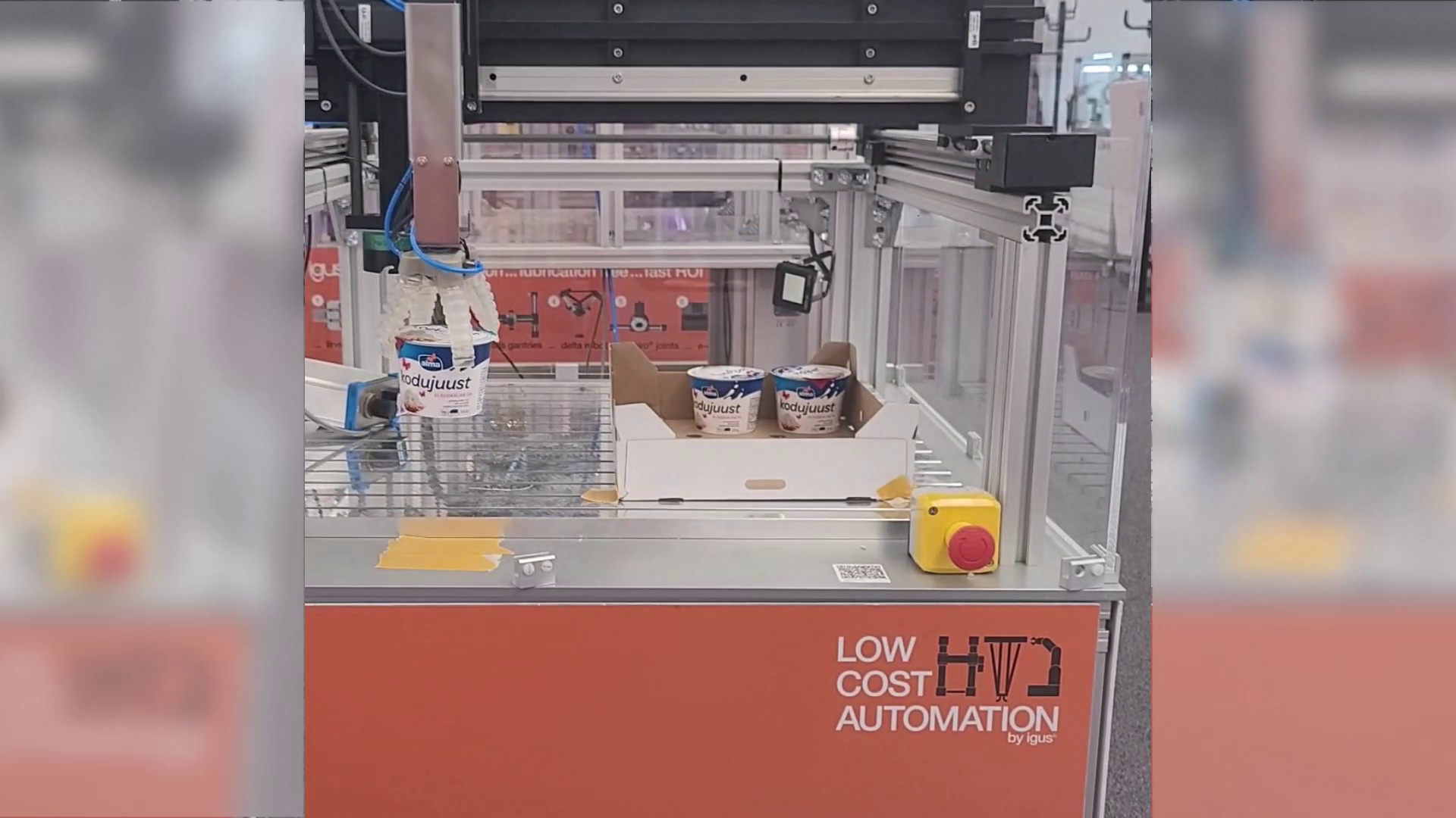 Il video mostra un processo specifico nell'industria alimentare. Per maneggiare i vasetti di yogurt vengono utilizzati un cartesiano igus e una pinza conforme FDA. La pinza raccoglie i vasetti di yogurt e li posiziona con precisione nei cartoni. L'intero processo viene eseguito in modo fluido ed efficiente, il che sottolinea le prestazioni e l'affidabilità del cartesiano igus e della pinza.